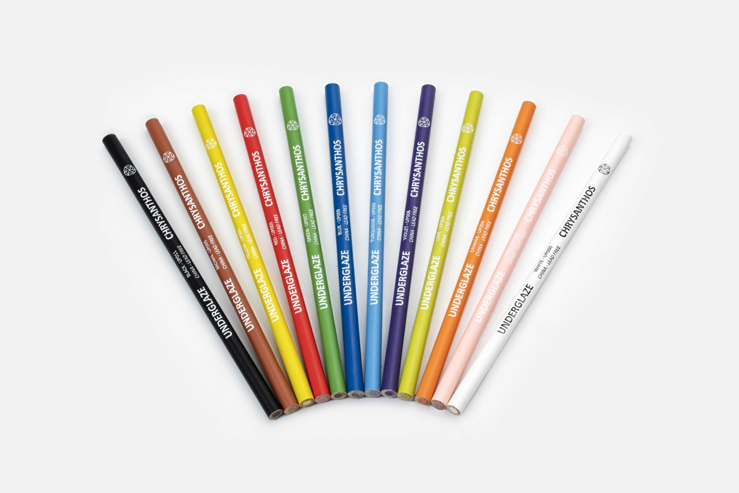 Tengos dos sets disponibles. El primero incluye Black, Red, Blue, Green, Yellow y Brown. El segundo trae Turquoise, Violet, Lime, Orange, Pink y White. También tengo unidades sueltas del lápiz de underglaze negro.